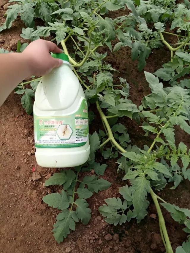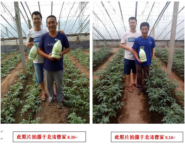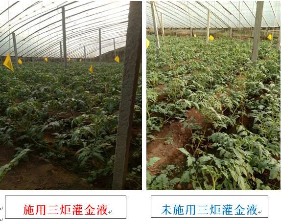 同樣的地塊,施用三炬灌金液之后,西紅柿明顯的葉片濃綠,莖稈粗壯,生長旺盛;另一半則是葉片發(fā)黃,莖稈細(xì)弱。