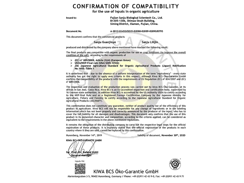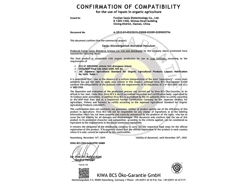 微生物菌劑歐盟有機(jī)認(rèn)證證書