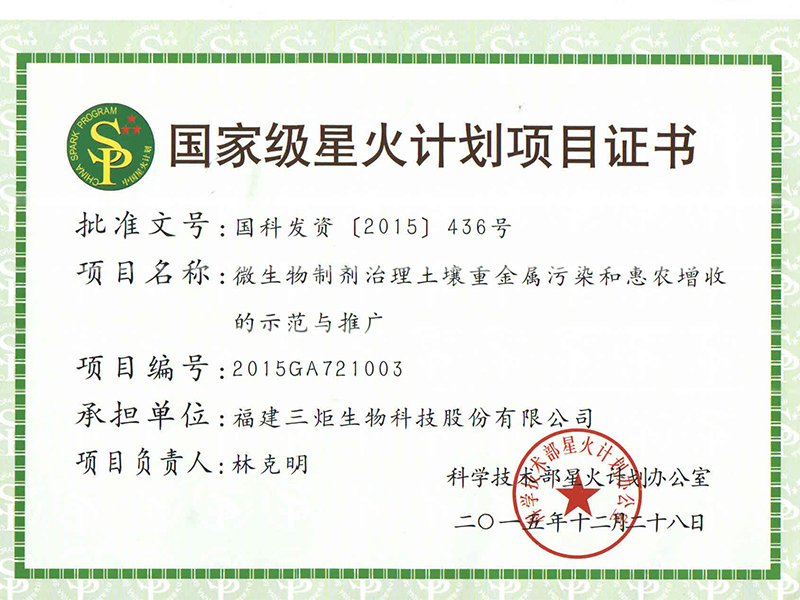 國(guó)家級(jí)星火計(jì)劃項(xiàng)目證書